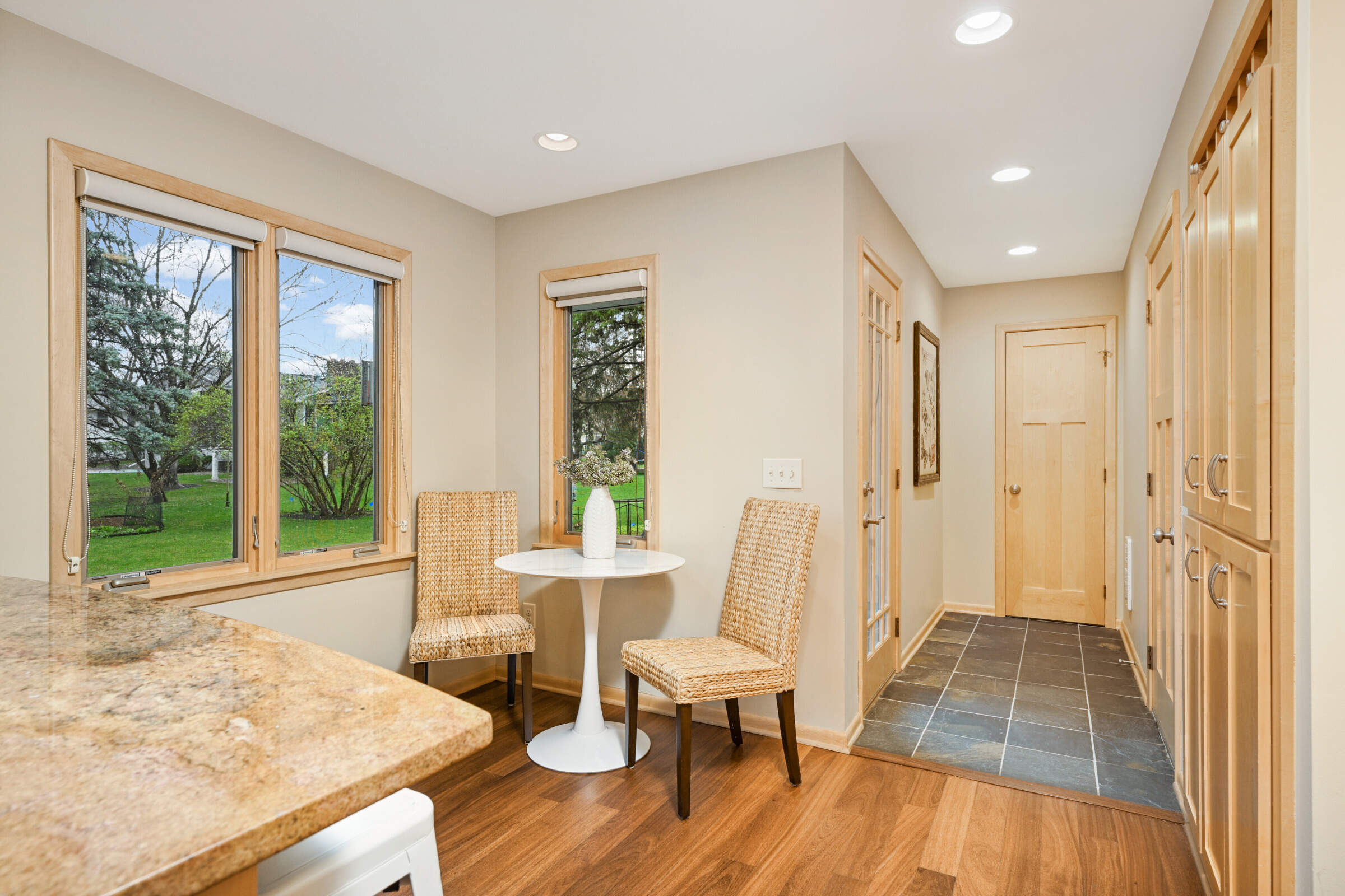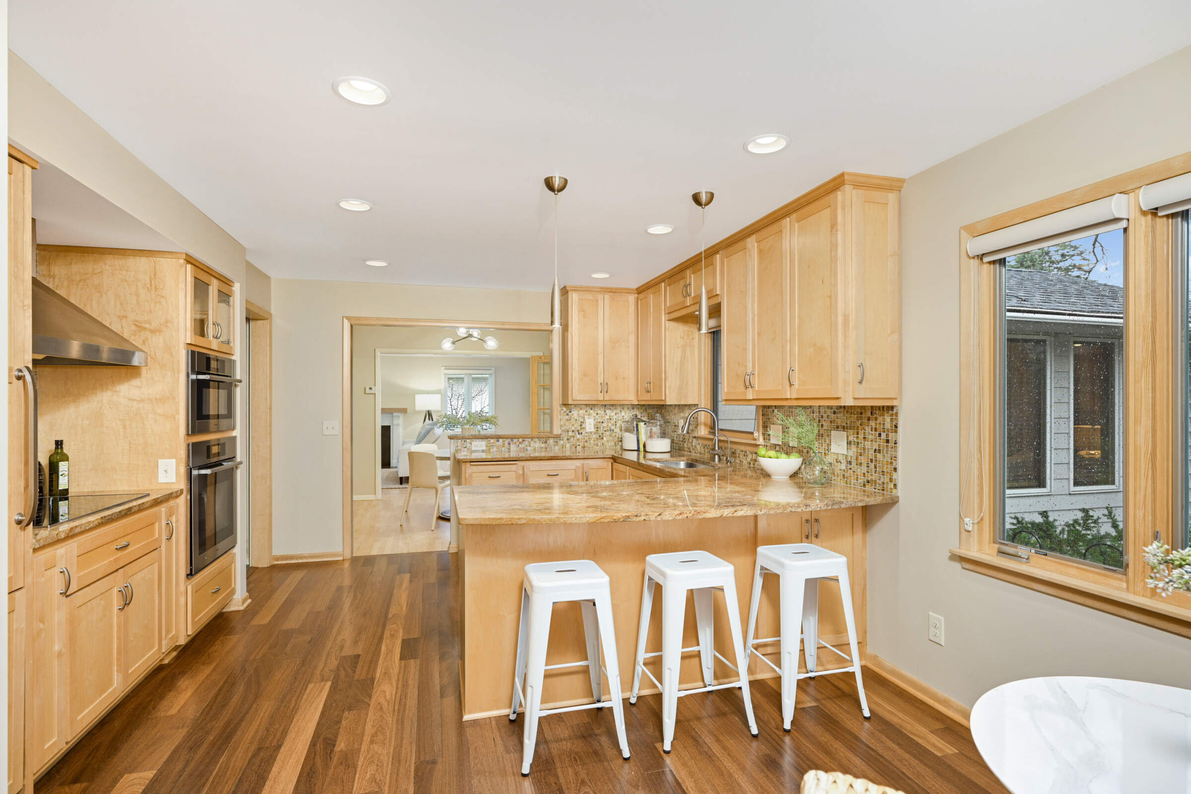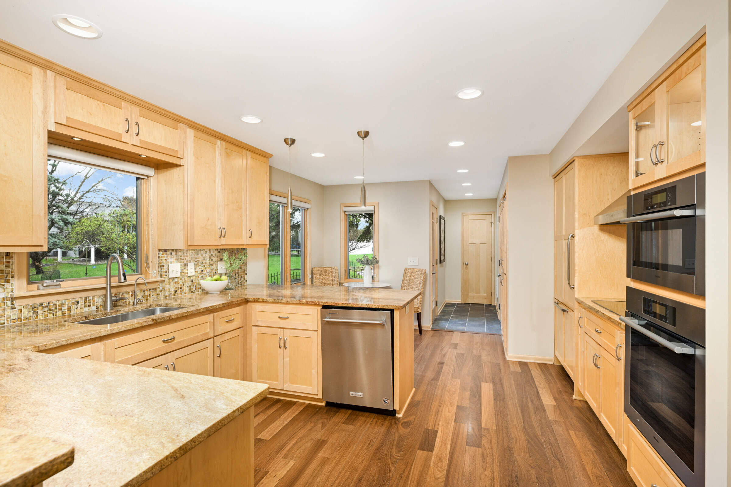 • The stunning remodeled kitchen boasts maple cabinets, granite countertops, tiled backsplash, Brazilian cherry wood flooring, stainless steel, Miele appliances, a breakfast bar and dining area.