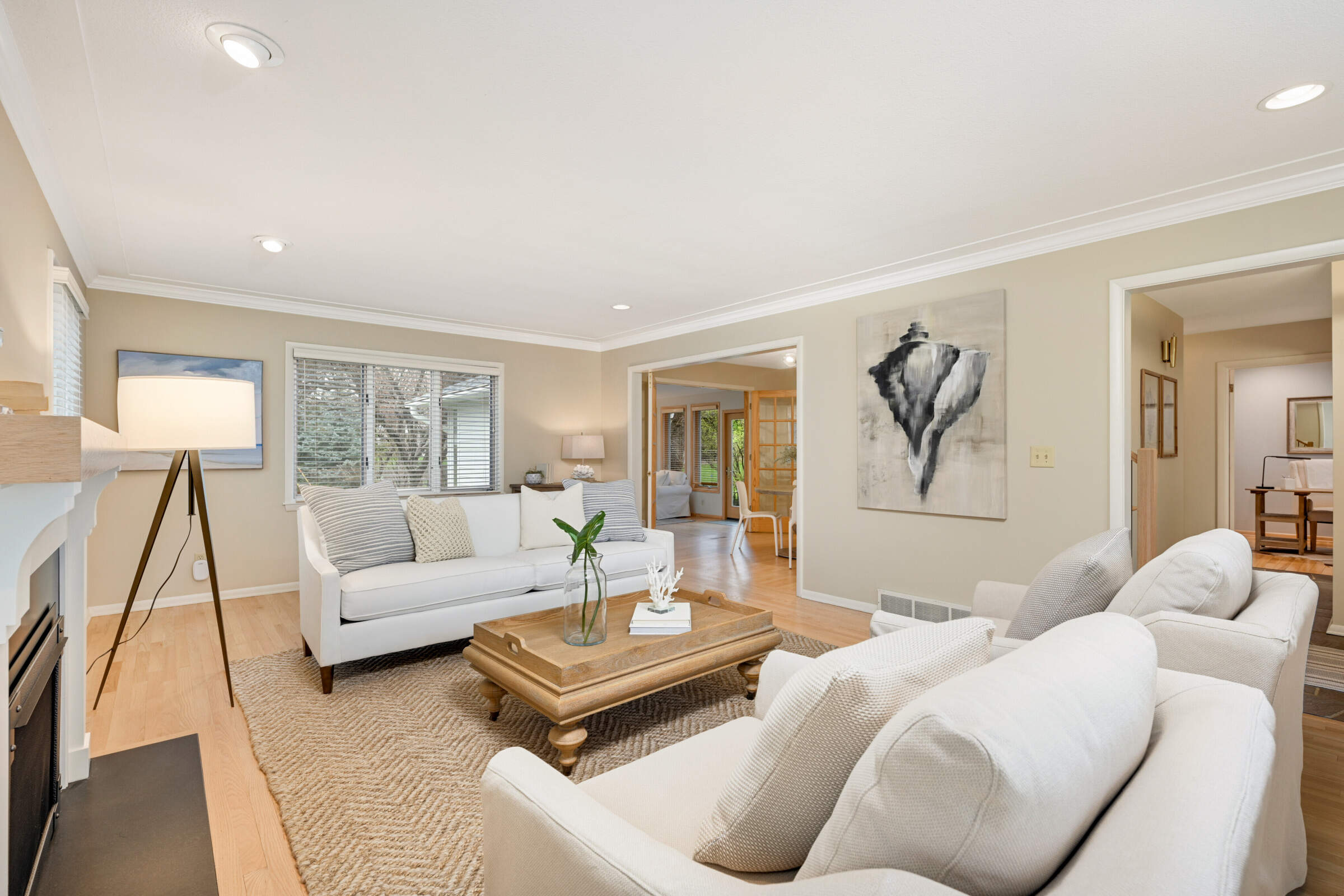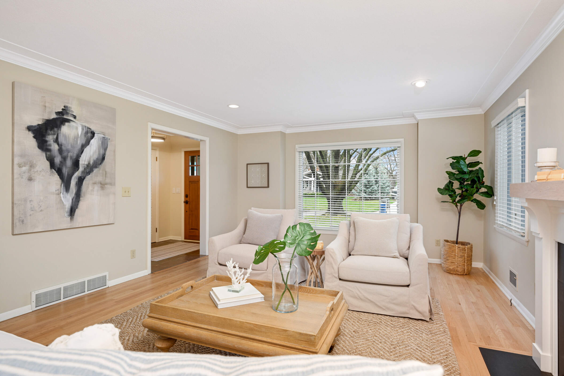• Great curb appeal with a covered front porch, a like new triple wide concrete driveway, LP maintenance-free SmartSide siding, LeafGuard Gutters and many Marvin re-appointed living room featuring a gas fireplace with new custom mantle, crown molding and refinished hardwood floors.