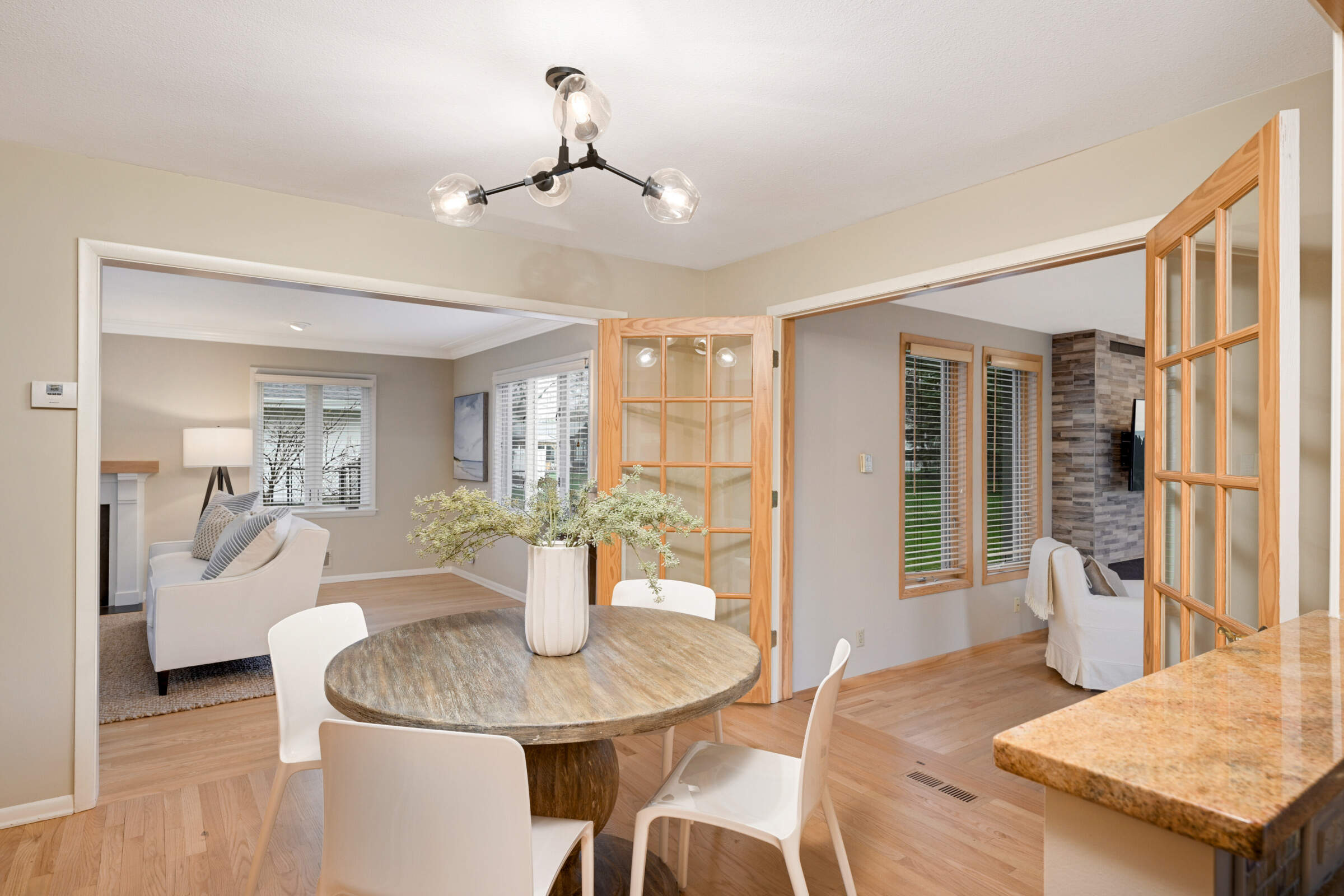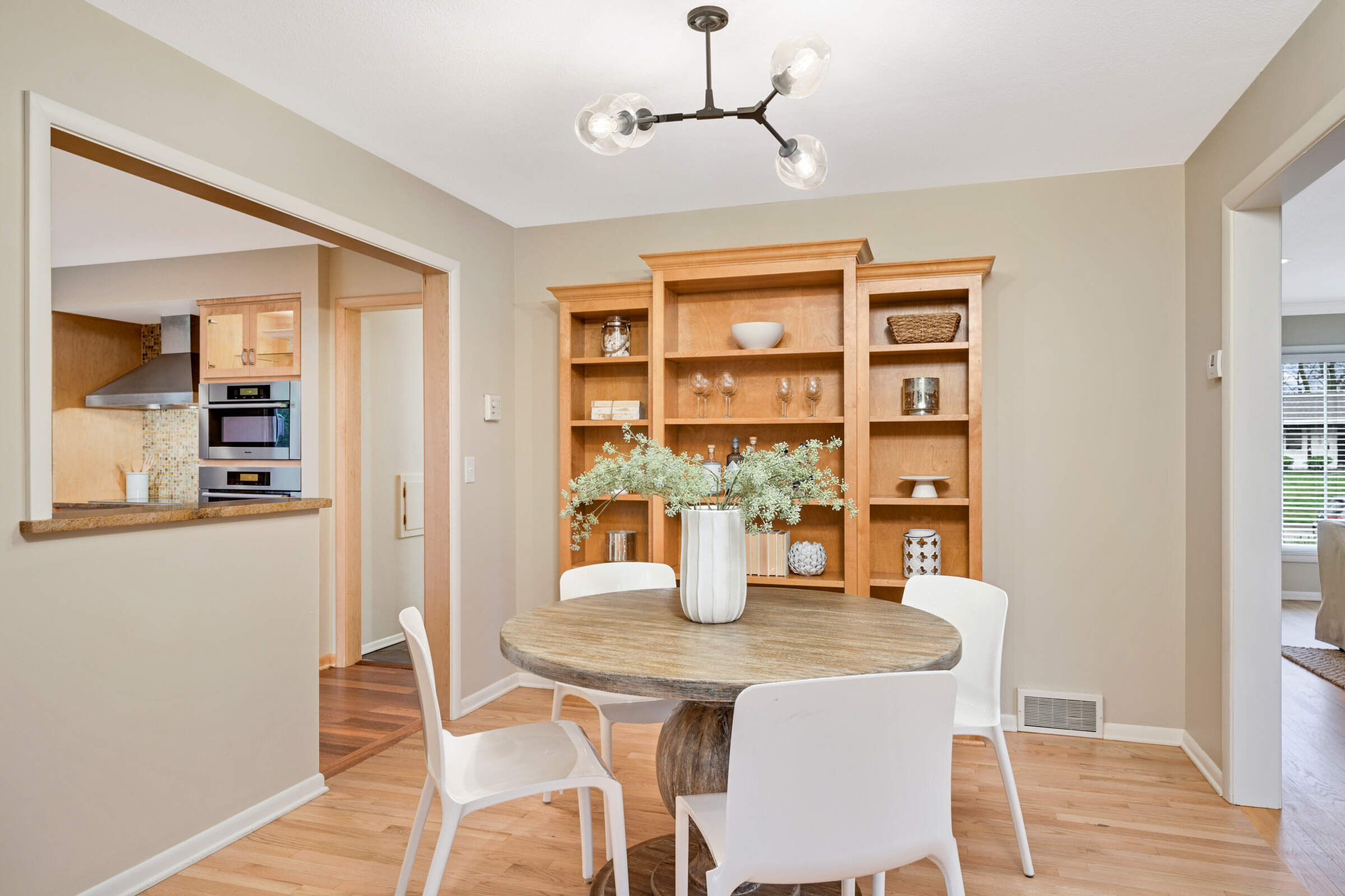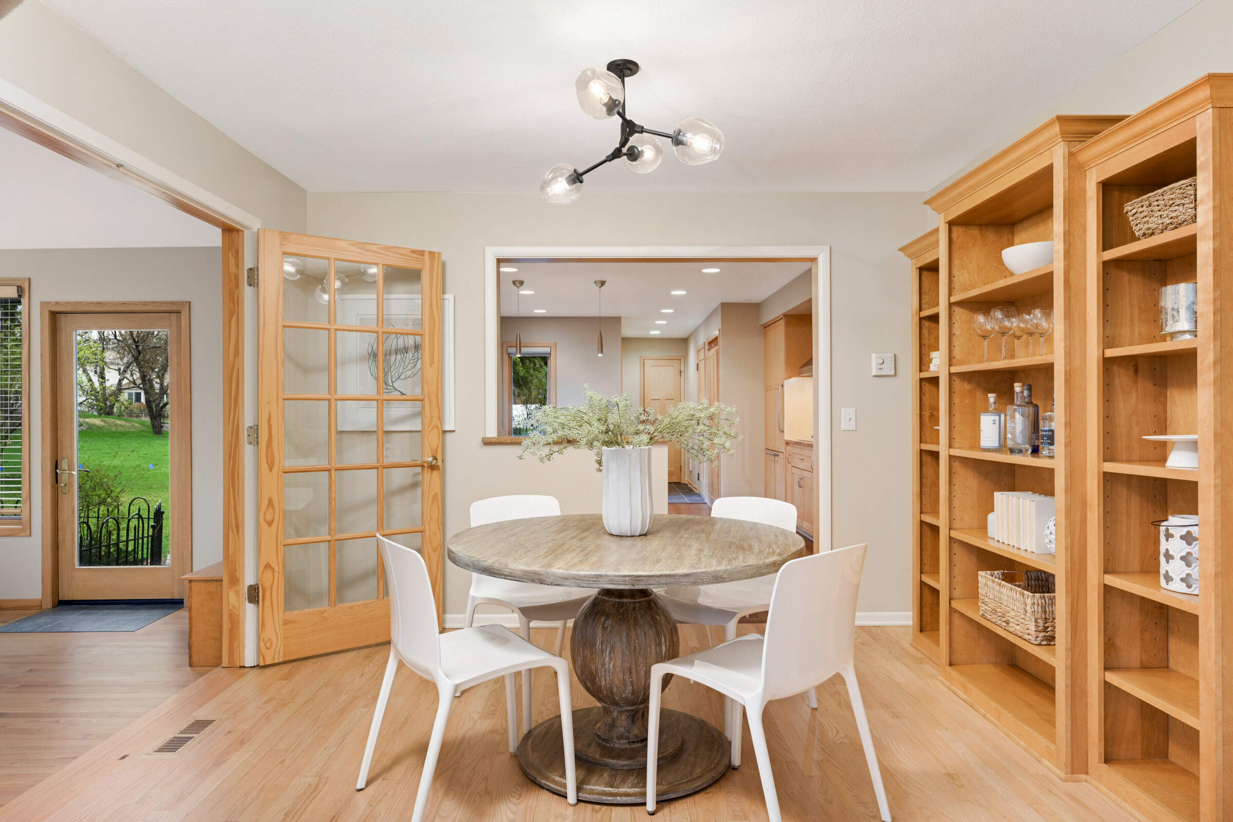 • The dining room has built-in shelving, has been opened to the kitchen and has French doors to the family room.