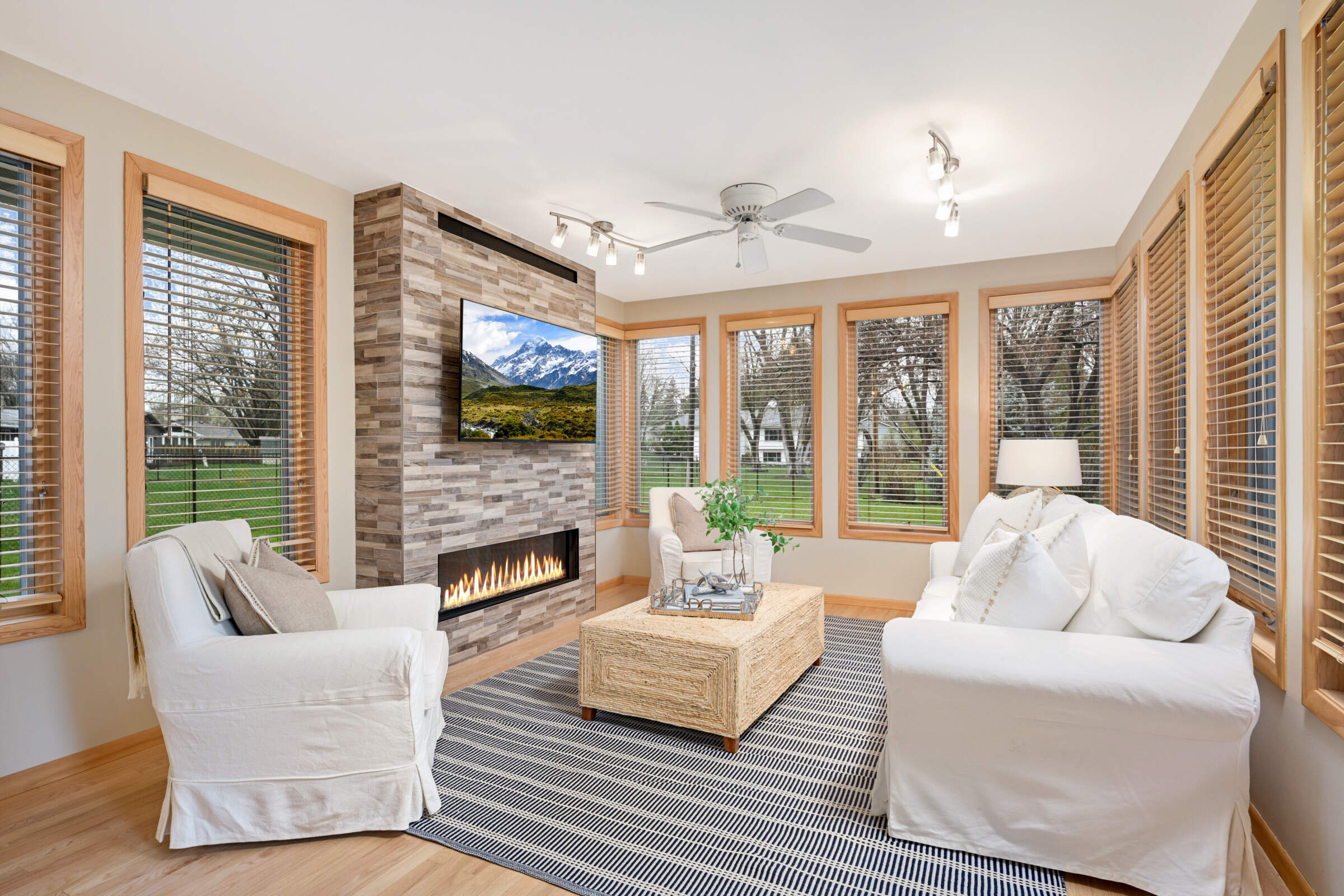 • The main floor family room has a ceiling fan, Pella windows, a door to the patio, and a striking tile wall with a beautiful Ortal dimensional fireplace and TV.